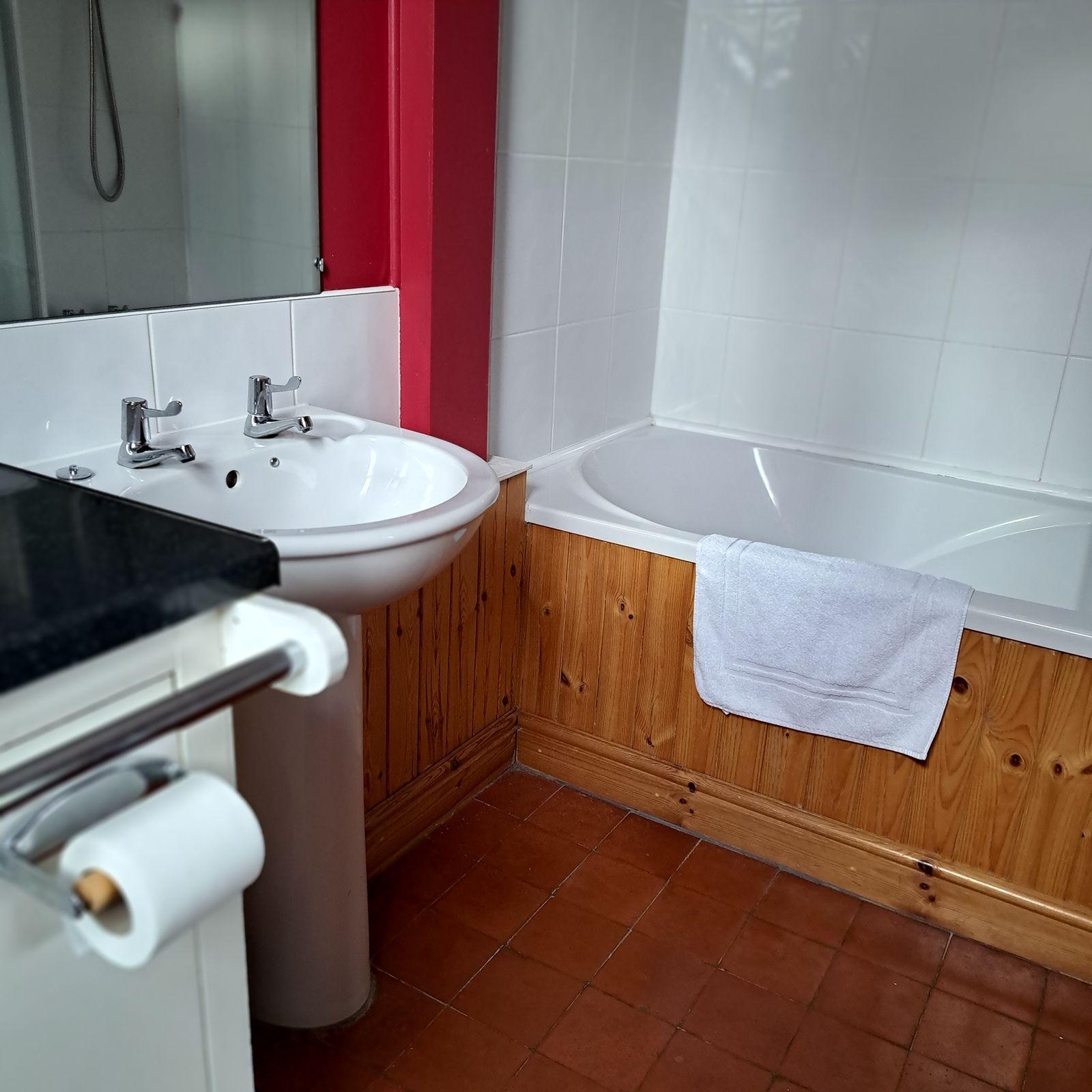 The downstairs room has a double bed and a small double z-bed, the ensuite has a bath with a shower over it. This rooms is wheelchair accessible with no steps to get to it and a rail next to the toilet.