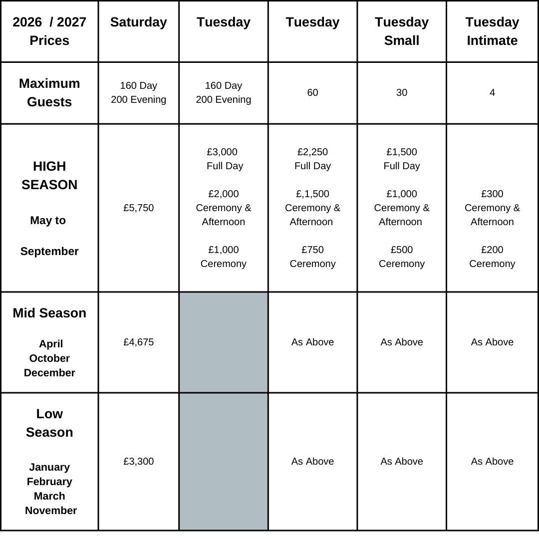 On Tuesdays the price varies on the number of guests and how long you would like to be here. We only host large Tuesday weddings May to September due to reduced parking available in other months.